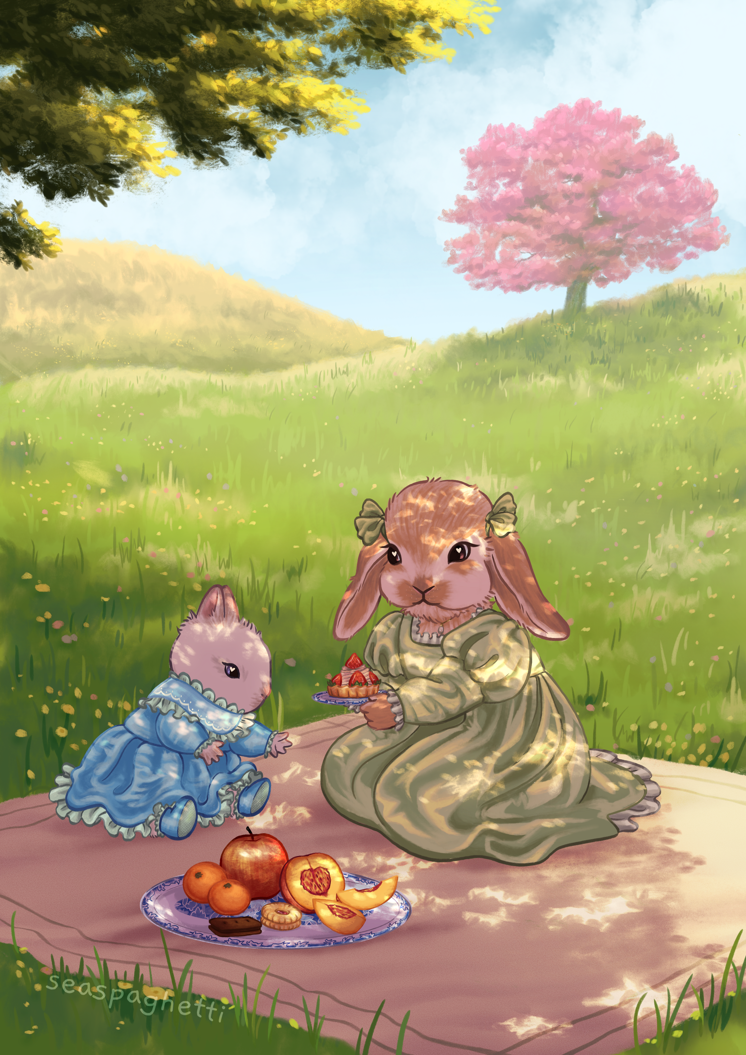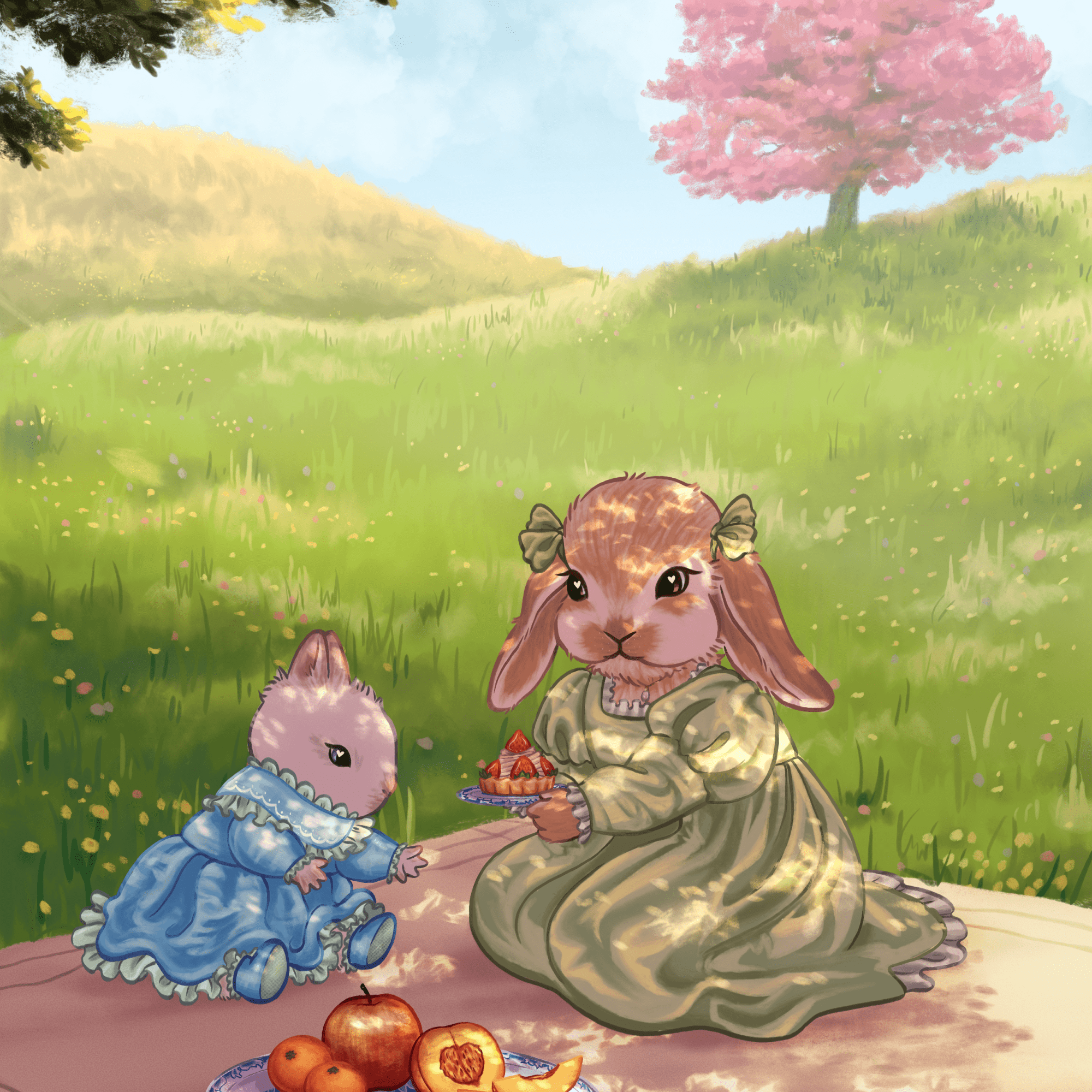 i illustrated this piece as a 2023 spring/summer print for my art shop – it features two bunny sisters in a quiet, sunny meadow sharing a tasty picnic